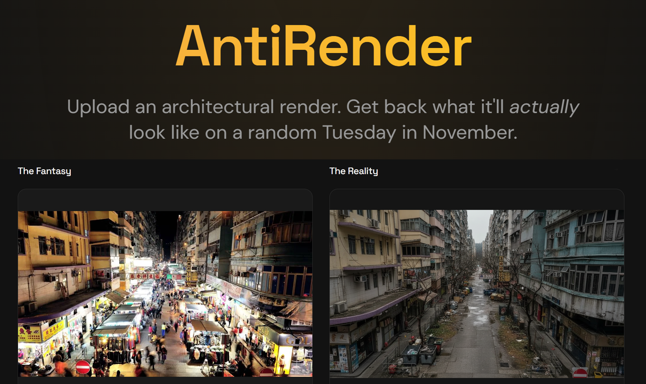 AntiRender 一個玩野的『反』建築 Render的 AI 一鍵處理 , 系統會把原圖轉成”現實的殘酷現實”影像:沒有例牌的陽光、沒有快樂家庭、沒有不真實的綠樹, 只剩下冷酷、誠實、令人沮喪的殘酷現實~~